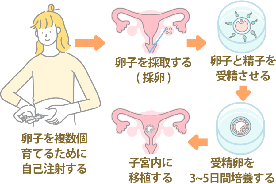 まず、卵子を複数個育てるための投薬や注射(自己注射または通院注射)を行い、卵巣を刺激します。その後、卵子を採取し、採取した卵子と精子をシャーレの中で受精させ、3~5日間培養した受精卵を子宮の着床しやすい場所に移植します。
