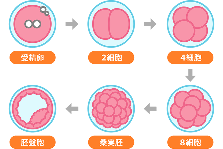 胚を子宮内と同じ環境の培養器に入れて、「胚盤胞」という状態になるまで最長6日間培養します。胚とは、細胞分裂を始めた受精卵のことで、受精卵は培養することで2分割、4分割、8分割と細胞分裂を繰り返し成長していきます。