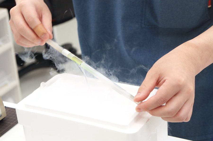 採取できた卵子は培養室に運ばれ、成熟卵を選定した上で液体窒素を使って、ガラス化保存法で凍結されます。ガラス化保存法とは、卵子の細胞内液を凍結保護剤に置き換え、細胞が壊れないように細胞内の水分をガラス状に凍結させることです。