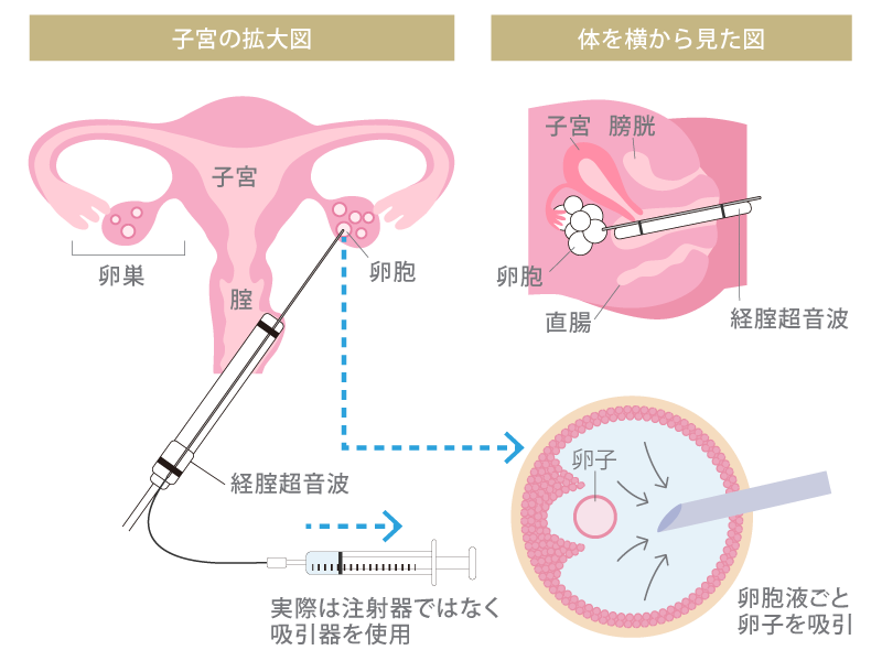 経腟超音波検査で排卵していないことを確認したのち、経腟超音波のプローブの先に針を装着し、腟に挿入して左右の卵巣から卵胞液ごと卵子を得ます。