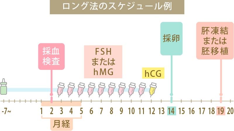 ロング法、ショート法、アンタゴニスト法、PPOS法、それぞれのスケジュールの例をご紹介します。採卵から胚移植までの流れについて、詳しく見ていきましょう。
