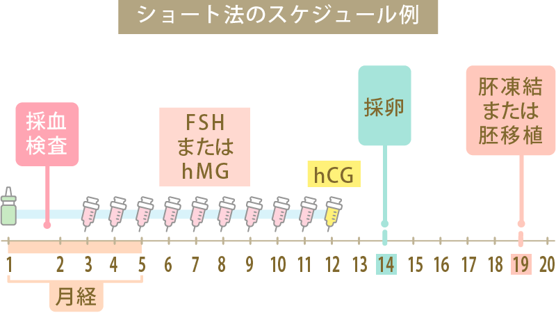 短期間ではありますが、採卵日まで点鼻薬と注射を1日も欠かさずに続けることが必要です。前周期からの準備が不要で薬の使用期間が比較的短くなること、年齢が高めの方でもできることがメリットです。