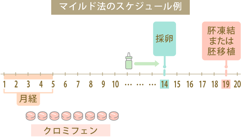 月経周期が正常周期(25~38日)の方、40代前後など年齢が比較的高い人、FSH(卵胞刺激ホルモン)の値が若干高めの人、月経周期初期の胞状卵胞数が少ない人などに向いている方法です。
