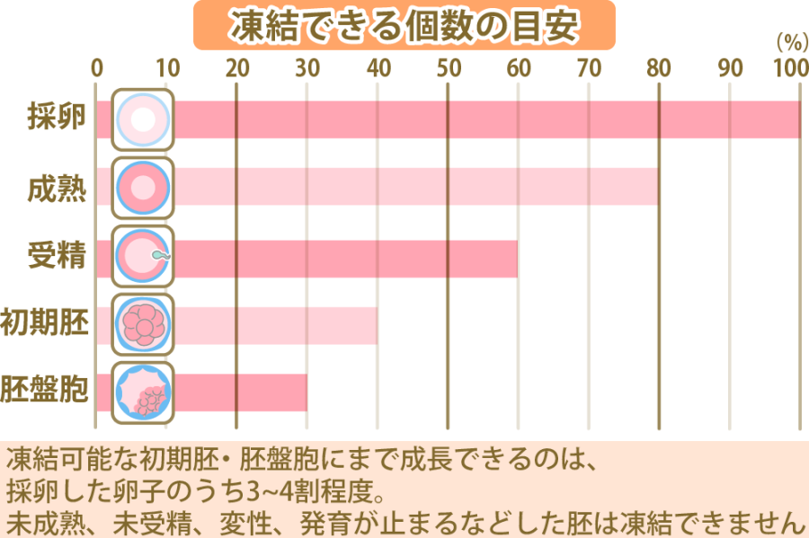 凍結融解胚移植の場合は、融解胚移植する際に妊娠可能と評価できる胚を凍結対象として選択するため、妊娠する確率も上がります。