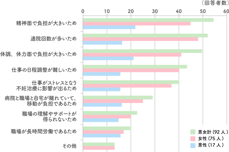 不妊治療と仕事の両立ができなかったのには、どのような理由があるのでしょうか。前述の厚生労働省の調査回答には、次のようなものが挙がっています。