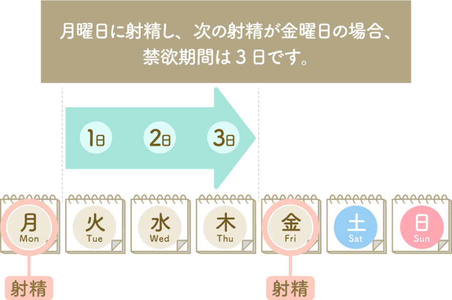 なお、禁欲期間は、射精をしてから24時間が経過した時点で「禁欲期間1日」、48時間が経過した時点で「禁欲期間2日」と数えるので注意してください。