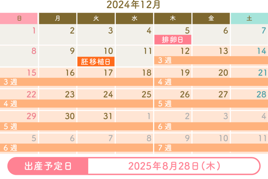 例えば、2024年12月10日に胚(受精卵)を移植した場合、排卵日は5日前の12月5日となり、この日を妊娠2週0日として数えます。出産予定日は280日後(40週0日)となるため、2025年8月28日です。