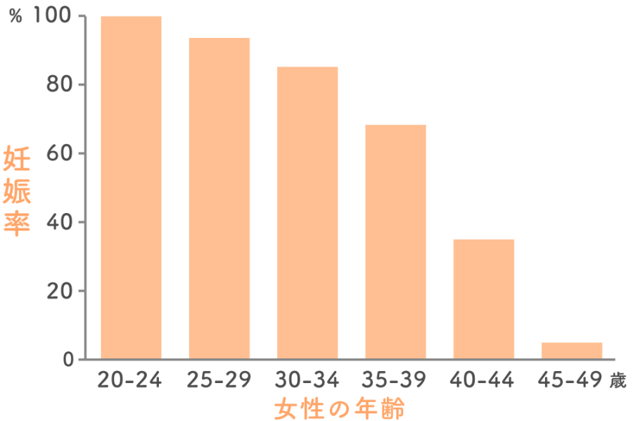 妊娠のしやすさには年齢が大きくかかわっています。35歳を過ぎると女性ホルモンの分泌量が低下するのと併せて、妊娠率も著しく低下します。