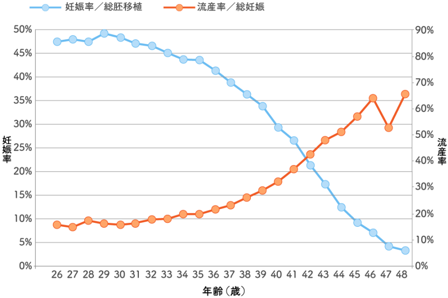 下記のグラフは、年齢ごとの妊娠率と流産率の関係を示しています。このデータから、30歳を過ぎる頃から妊娠率が徐々に低下し始め、特に35歳以降で急激に下がることが明らかです。一方、流産率は30歳を過ぎたあたりから徐々に上がり始め、35歳以降では急激に上昇します。このように、高齢になるほど妊娠の難度が上がるだけでなく、流産のリスクは高くなるのが実情です。