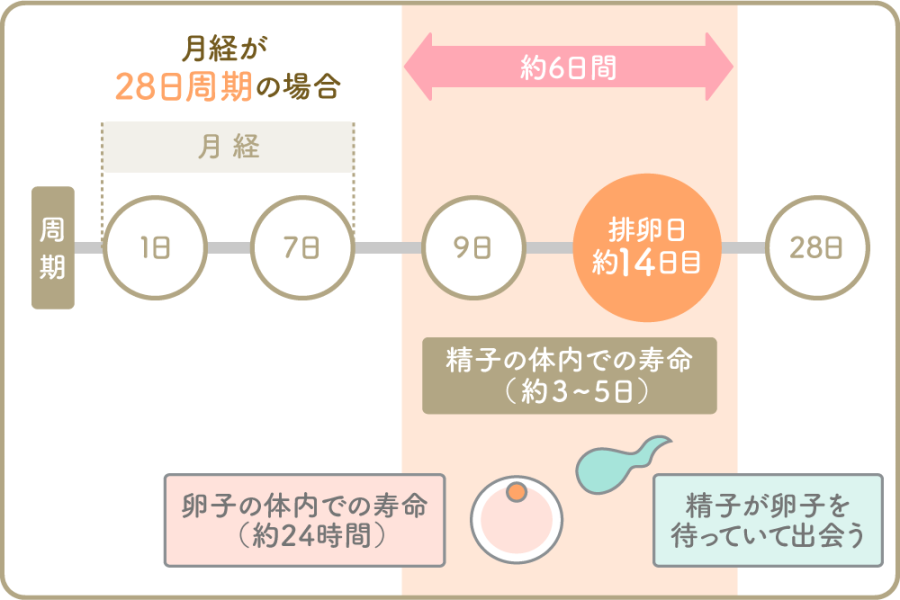 精子は、女性の体内に入ると平均で2~3日間、最長で5日間程度生存できるといわれています。一方、卵子の寿命は排卵後約24時間と非常に短いものです。このため、最も妊娠しやすいタイミングは、排卵日当日、またはその直前に精子が体内で卵子を待っている状態です。