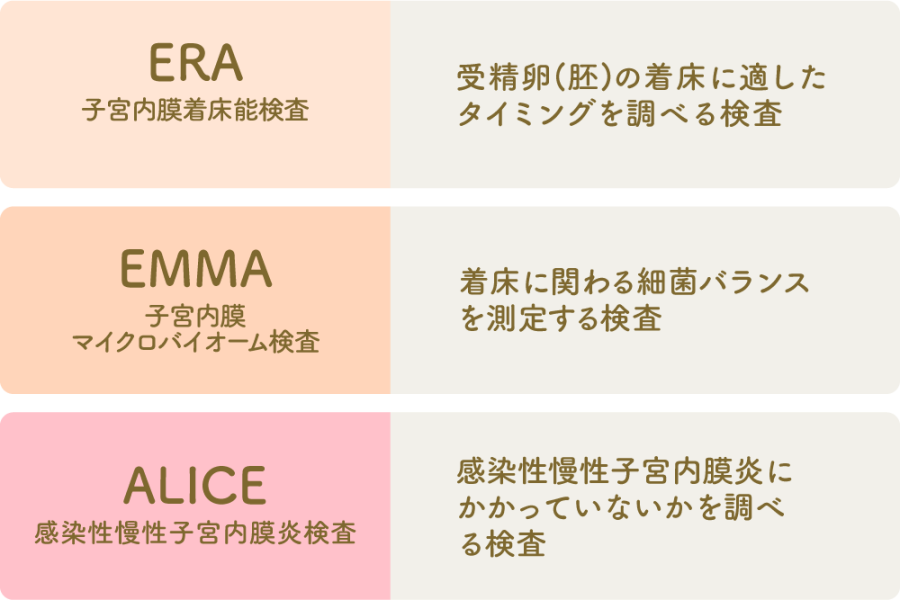トリオ検査(TRIO検査)には、ERA、EMMA、ALICEの3つの検査が含まれます。これらはすべて、子宮内膜の細胞を採取する検査です。ここでは、トリオ検査に含まれる3つの検査で、それぞれ調べられることについて詳しく解説します。