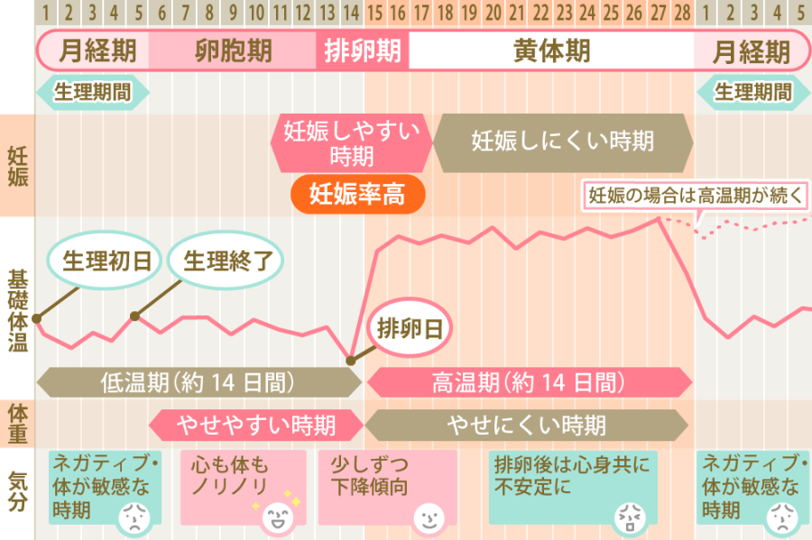 月経がはじまると基礎体温は低温期に入ります。月経周期が28日の場合、約14日間の低温期を経て、排卵日を挟んで高温期へと移行します。高温期は低温期と同様に約14日間続き、次の月経が来ると再び低温期になるのが基本的なサイクルです。