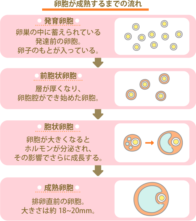 卵胞とは、卵子のもととなる細胞を包み込んだ袋のことです。各卵胞に1つの卵子があると考えられており、胎児期に卵巣内で作られた卵胞は、「原始卵胞」という卵子が休眠した状態のまま、卵巣内に多数保存されています。原始卵胞は月経が始まると活発に動き始め、「発育卵胞」「前胞状卵胞」「胞状卵胞」「成熟卵胞」へと発育し、排卵に至る流れです。