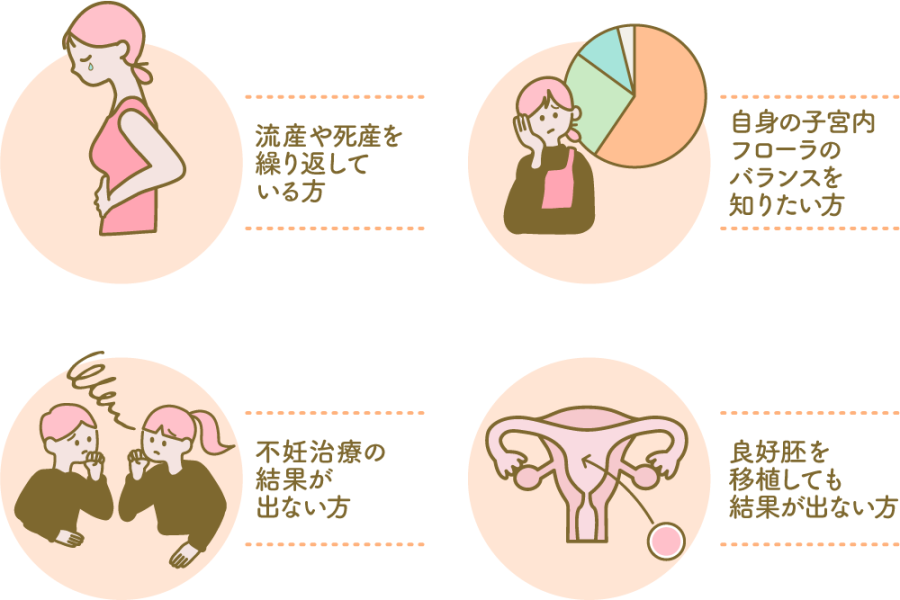 子宮内フローラ検査は、妊娠を希望するすべての女性を対象とした検査です。特に、不妊治療を受けても妊娠に至らない方や、流産・死産経験を繰り返す方に向いています。子宮内フローラ検査の主な対象者は下記のとおりです。なお、検査時に不正出血がある場合や子宮内感染症の疑いがある場合などは、検査を受けられないこともあるため、不安な点がある方は事前に医師に相談しましょう。
