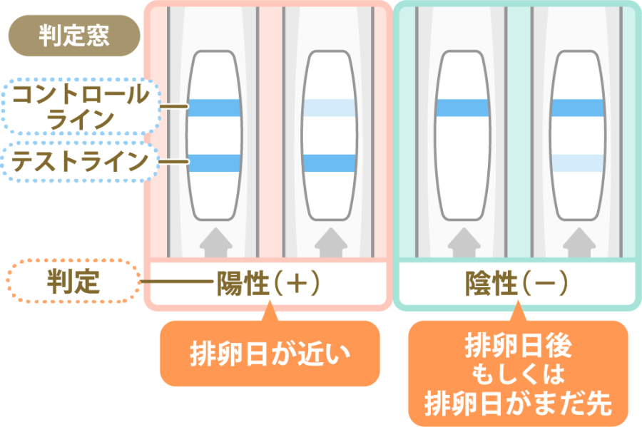 説明書にある判定時間が経過したら、判定窓を観察して陽性か陰性か確認しましょう。判定の表示は、製品ごとに異なりますが、一般的なのは判定窓に、検査が有効かを示す「コントロールライン」と、LHサージを判定する「テストライン」の2本が現れるタイプです。2本の線の有無や色の濃淡によって、陽性か陰性かを判定します。
