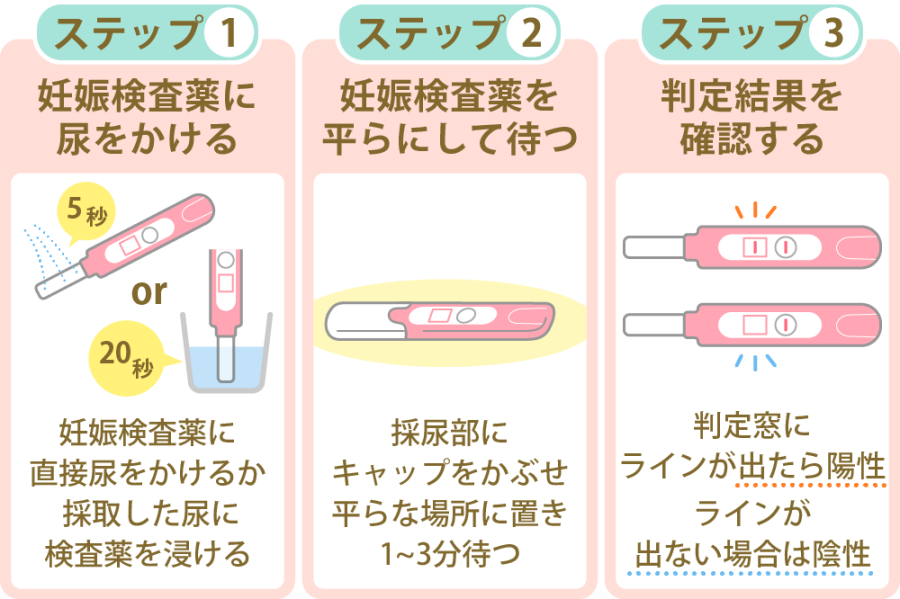なお、一般的な妊娠検査薬の使い方は次のとおりです。商品によって使用方法が異なる場合があるため、必ず各商品の説明書を確認してから検査を行ってください。