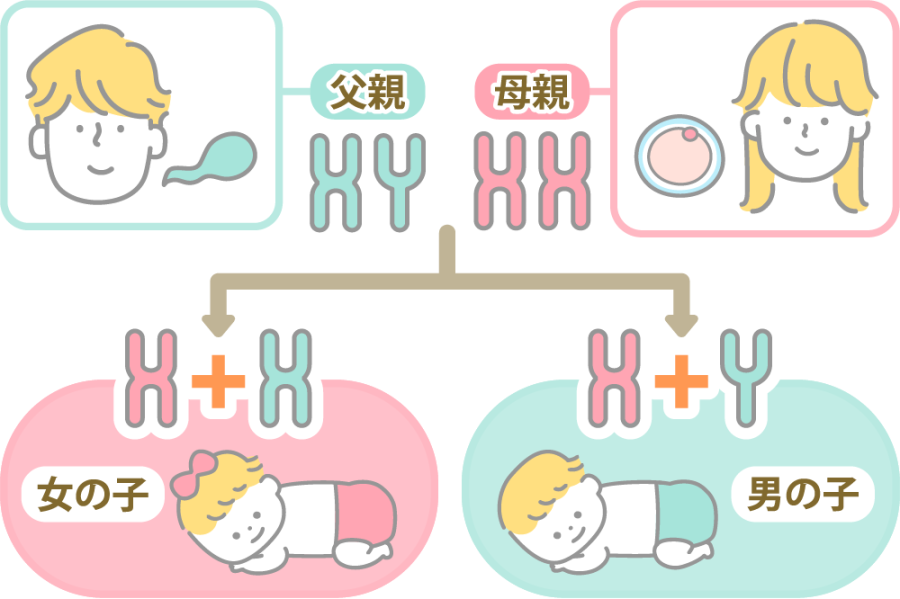 受精の際に、X精子と結びつくと女の子になり、Y精子と結びつくと男の子になる仕組みです。