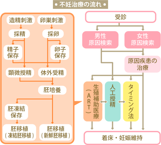 不妊治療を受けることについて夫婦間で合意したら、まずは婦人科を受診して検査を行います。男女共に仕事との両立を考えるためにも、大まかな不妊治療の流れを把握しておきましょう。