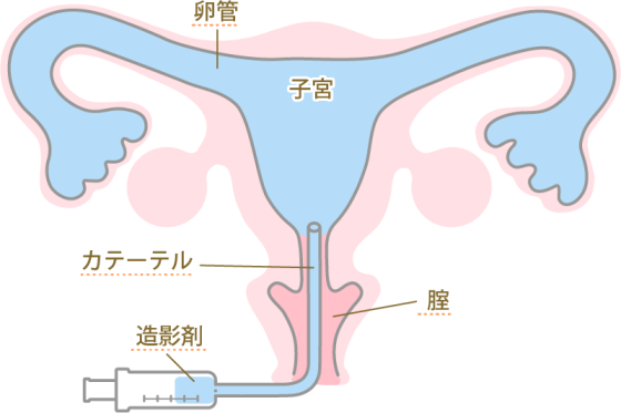 膣からチューブを入れて膨らませ、子宮内に固定します。チューブから造影剤を注入します。