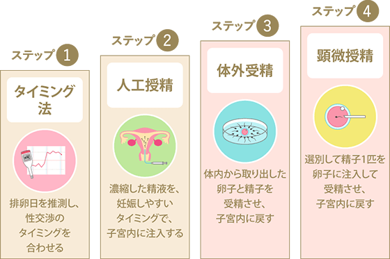 不妊治療は、同じ治療を続けていても妊娠率は次第に頭打ちとなってしまいます。不妊の原因や年齢を考慮しながらステップアップすることが妊娠の早道です。