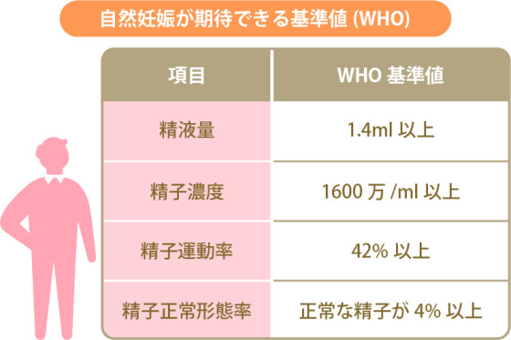 WHO(世界保健機関)が規定している「自然妊娠が期待できる基準値」とは、正常な形状の精子が、自分の力で卵子の中に入り込めるかどうかの判断基準です。精子検査を実施し、調整後の精子の濃度や運動量が基準値を下回っている場合、顕微授精が適用されます。